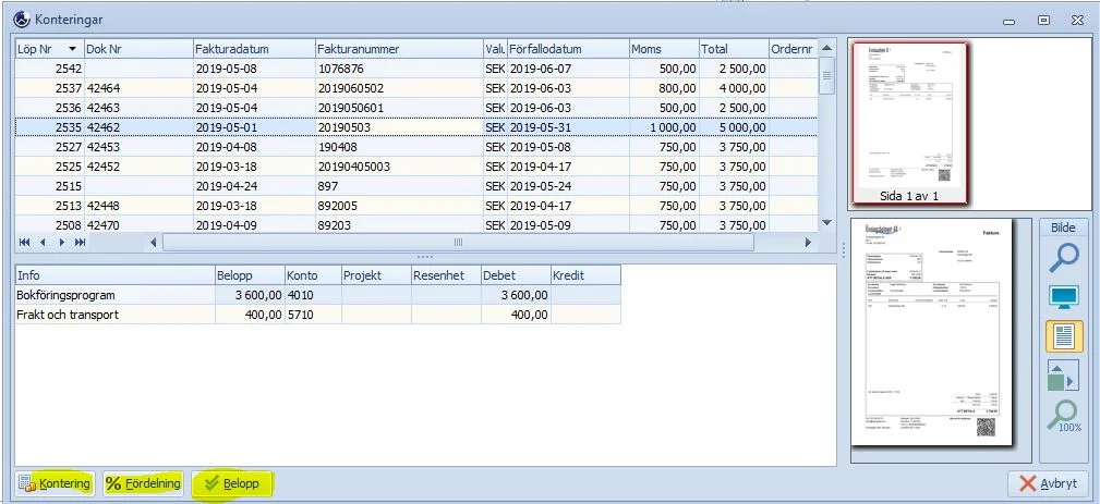 I samband med registreringen av en faktura kan man välja att titta på tidigare fakturor från denna leverantör och även kopiera konteringar och fördelningar från önskad faktura. Man väljer själv om man vill kopiera hela konteringen, belopp eller en procentuell fördelning. Detta kommer att underlätta konteringsarbetet avsevärt, inte minst då det gäller fakturor med många konteringsrader..!