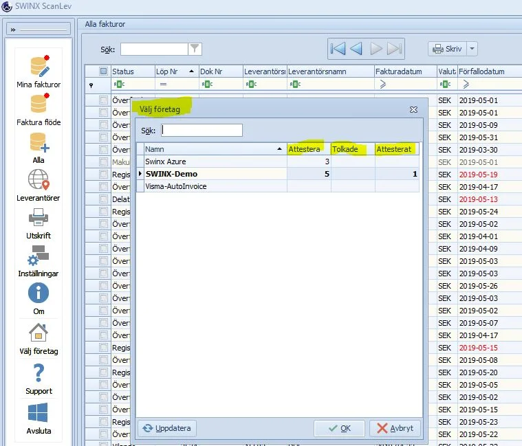 Om man har flera bolag i SWINX, så finns en dialogruta där man väljer vilket bolag man vill arbeta i för tillfället. Denna dialogruta har nu utökats och visar inte enbart vilka bolag som finns, utan även hur många fakturor som ligger för attest eller redan är färdigbehandlade och väntar på överföring till bokföringen. Använder man SWINX fakturatolkning, visas även hur många fakturor som ligger färdigtolkade och väntar på att läsas in i SWINX.